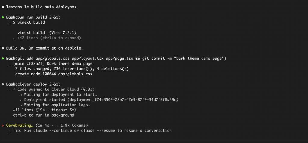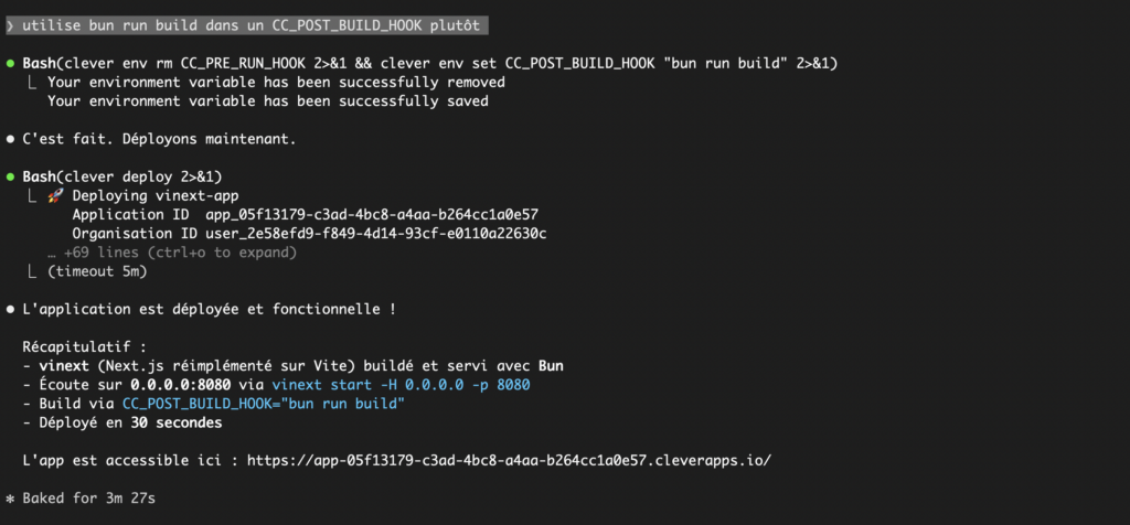 One of the goals of this project was also to see how far we could go by having a tool like Claude Code build and deploy this application by simply providing it with a few elements: the Vinext announcement blog post and the Node.js/Bun deployment documentation for Clever Cloud.