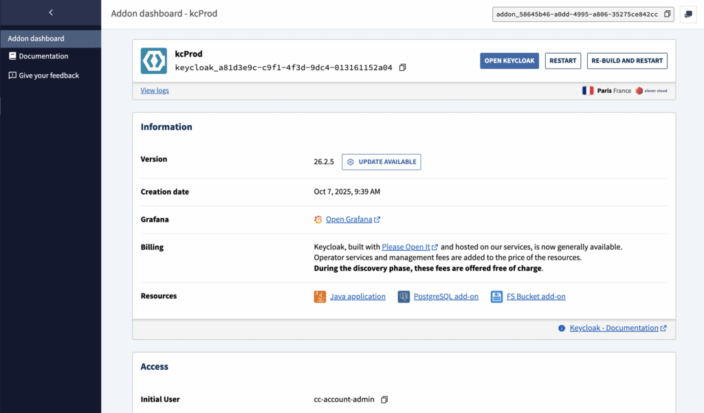 In addition, we have kept strengthening the managed services we offer across the platform, including Keycloak, Matomo, Metabase, and Otoroshi. All of them are now available in their latest versions, with the ability to manage updates at creation time and from the Console dashboard, as well as to enable advanced features when needed.